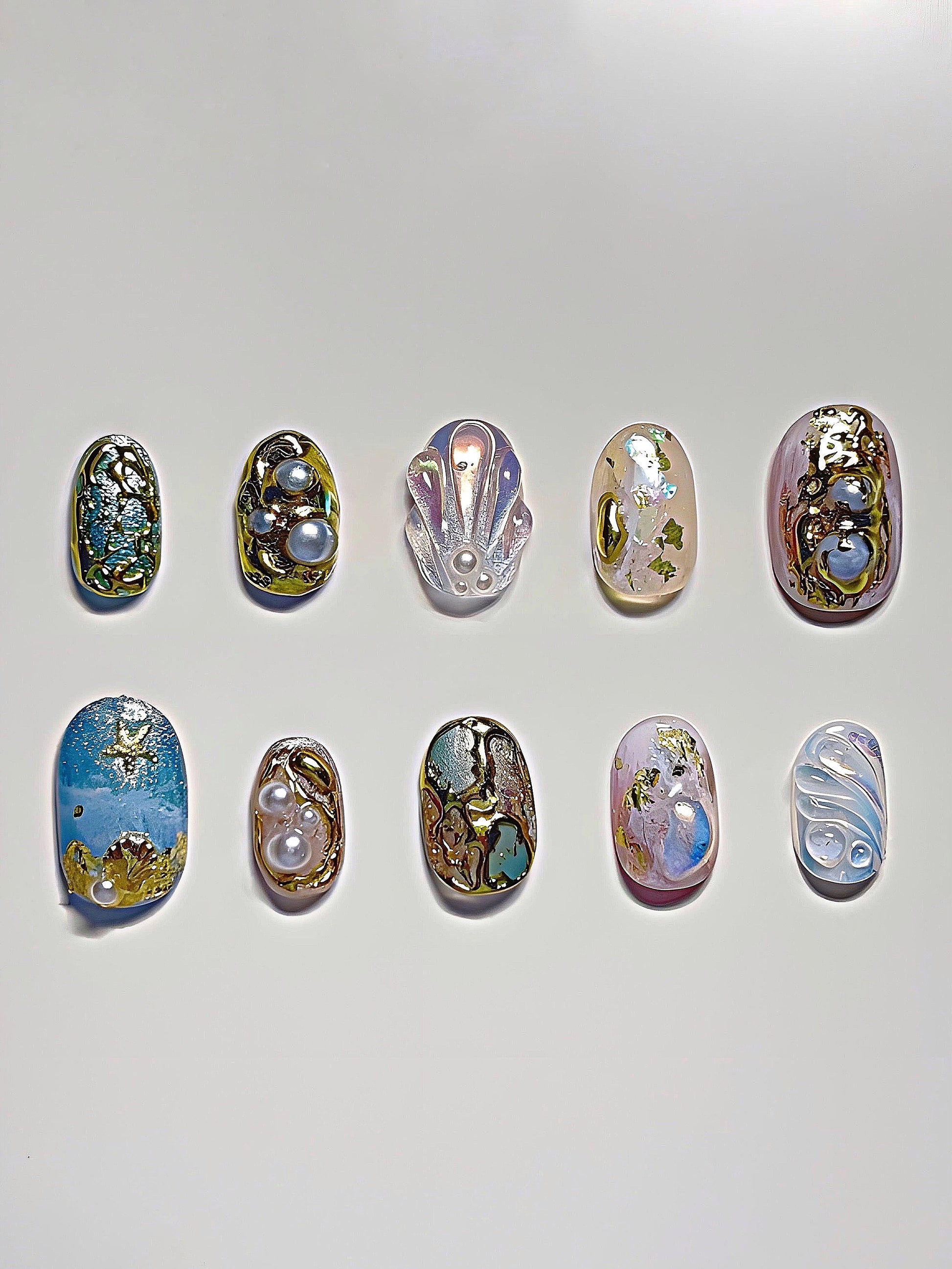 mermaid-inspired nails, crafted with a blend of shimmering glitters, blooming effects, and cat-eye gels, topped with iridescent chrome, hand-drawn 3D gold designs, and pearls—capturing the ethereal beauty and mystique of a mermaid’s undersea kingdom