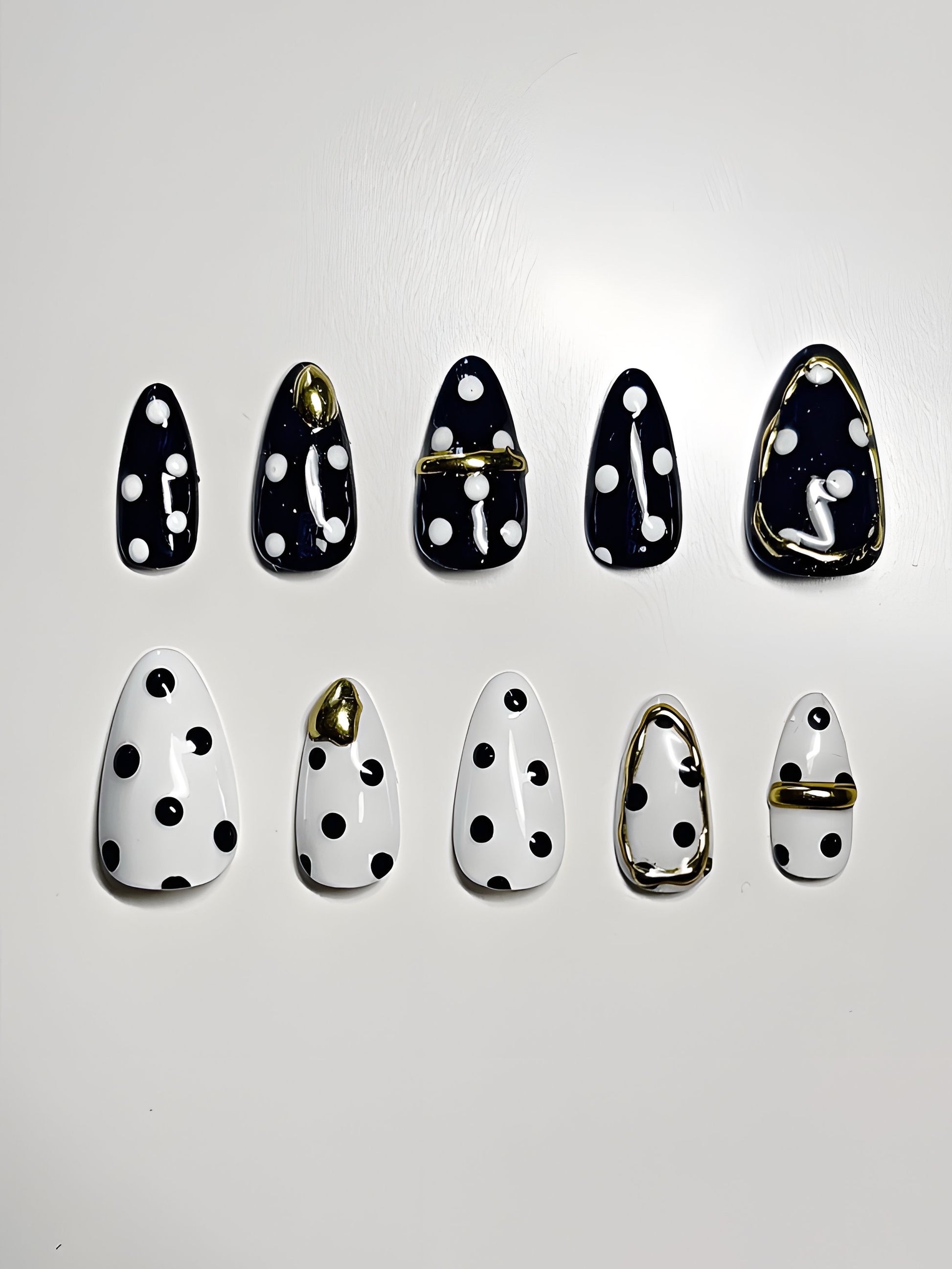 a bubbly burst of charm with a golden wink— this set brings retro polka dots back with a twist. bold, playful, and topped with a tiny touch of gold, it’s the life of the manicure party