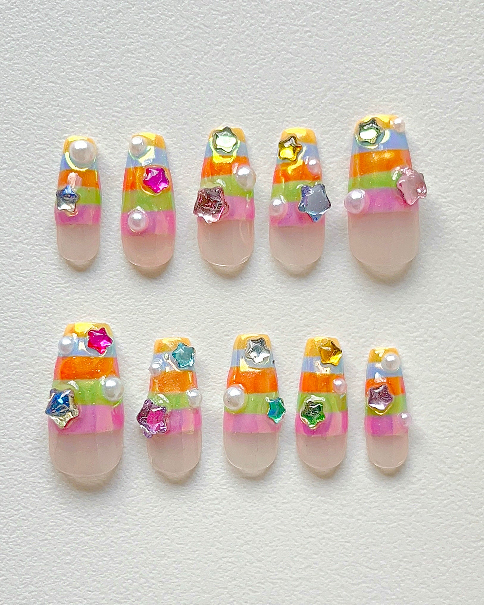 bright rainbow stripes enhanced with a colorful chrome finish, decorated with star-shaped beads and pearl accents for a bold and playful look
