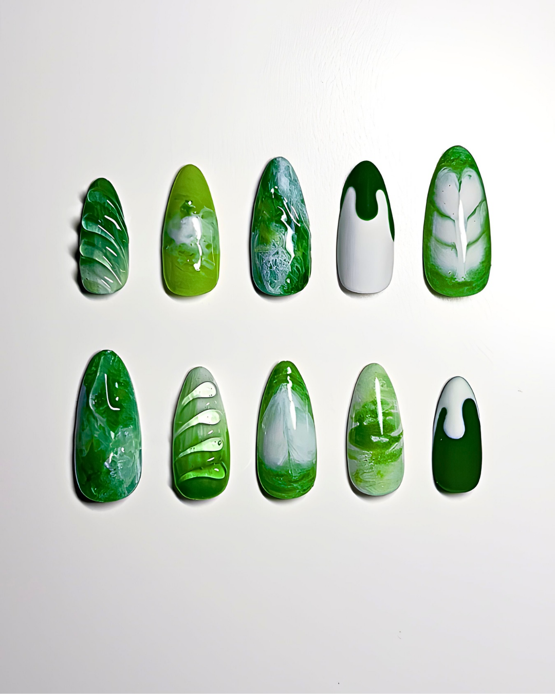 a soothing matcha latte-inspired nail set, blending creamy white swirls with rich green hues, reminiscent of frothy latte art—calm, cozy, and deliciously stylish