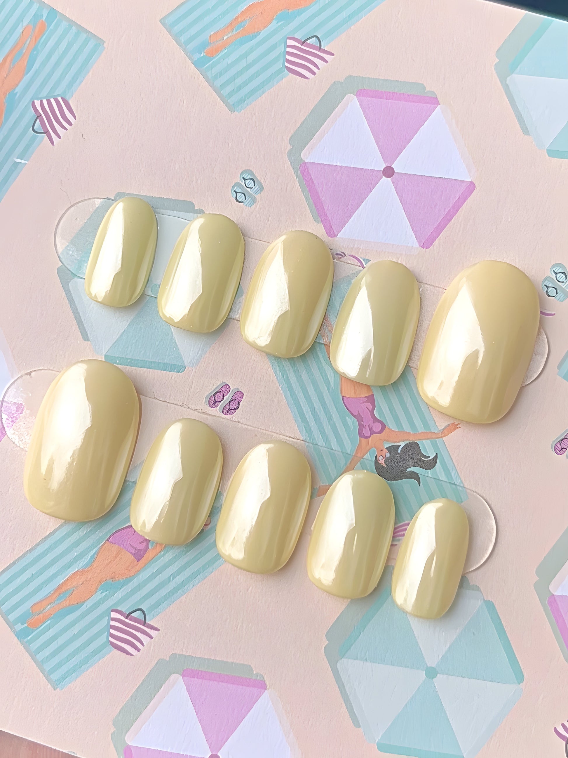 solid one-color full set - pictured: butter yellow on oval short shape + pearl chrome finish
