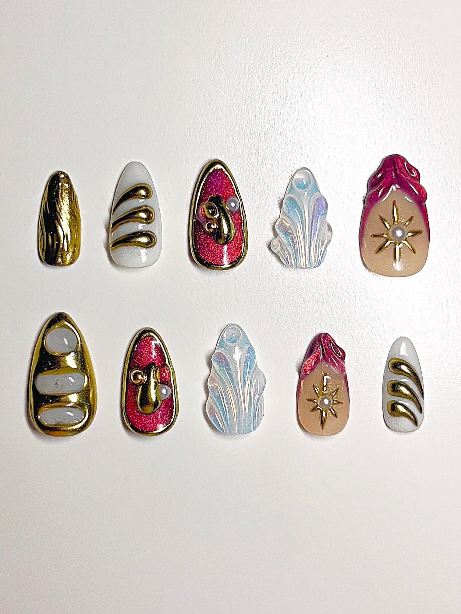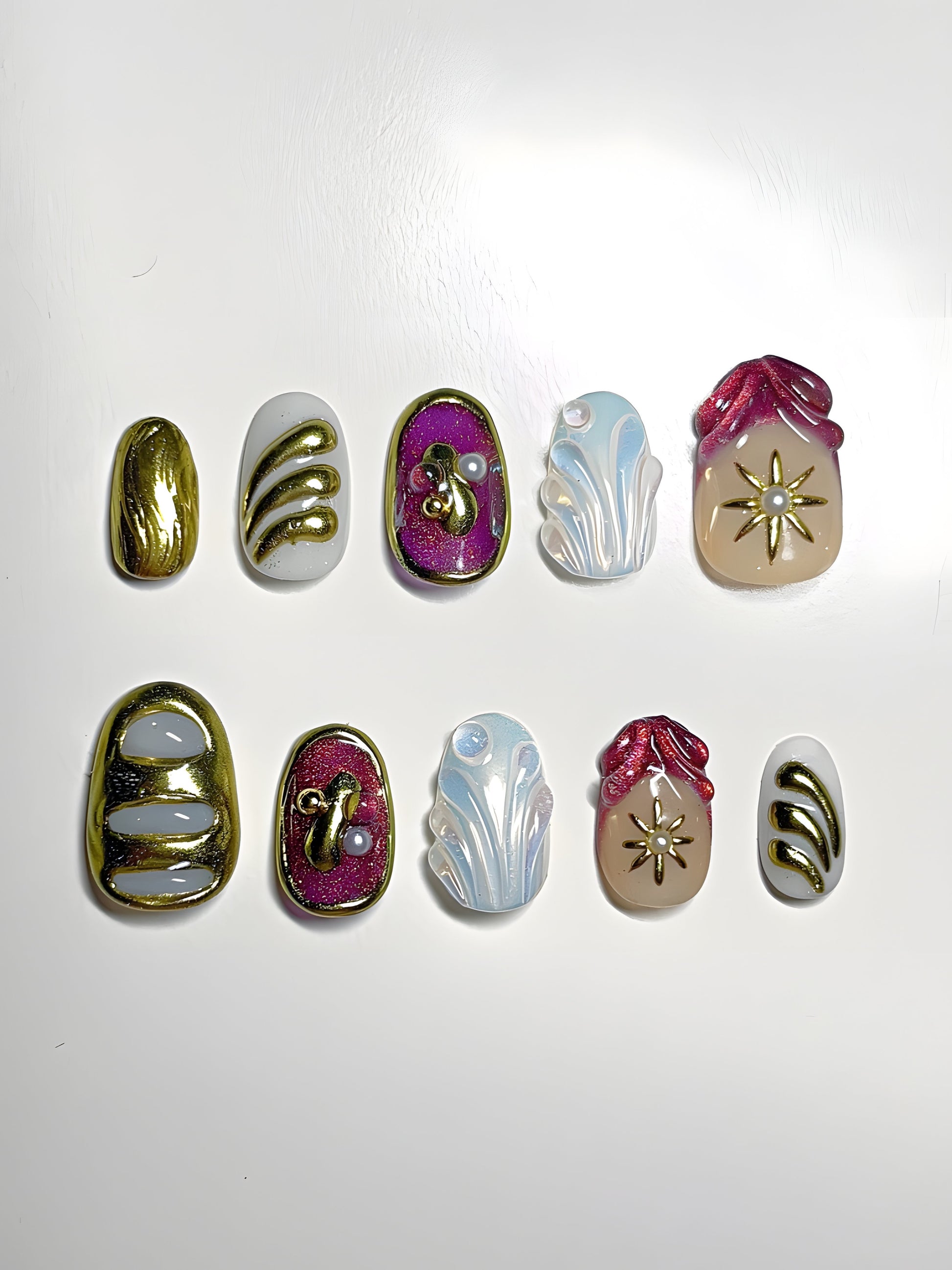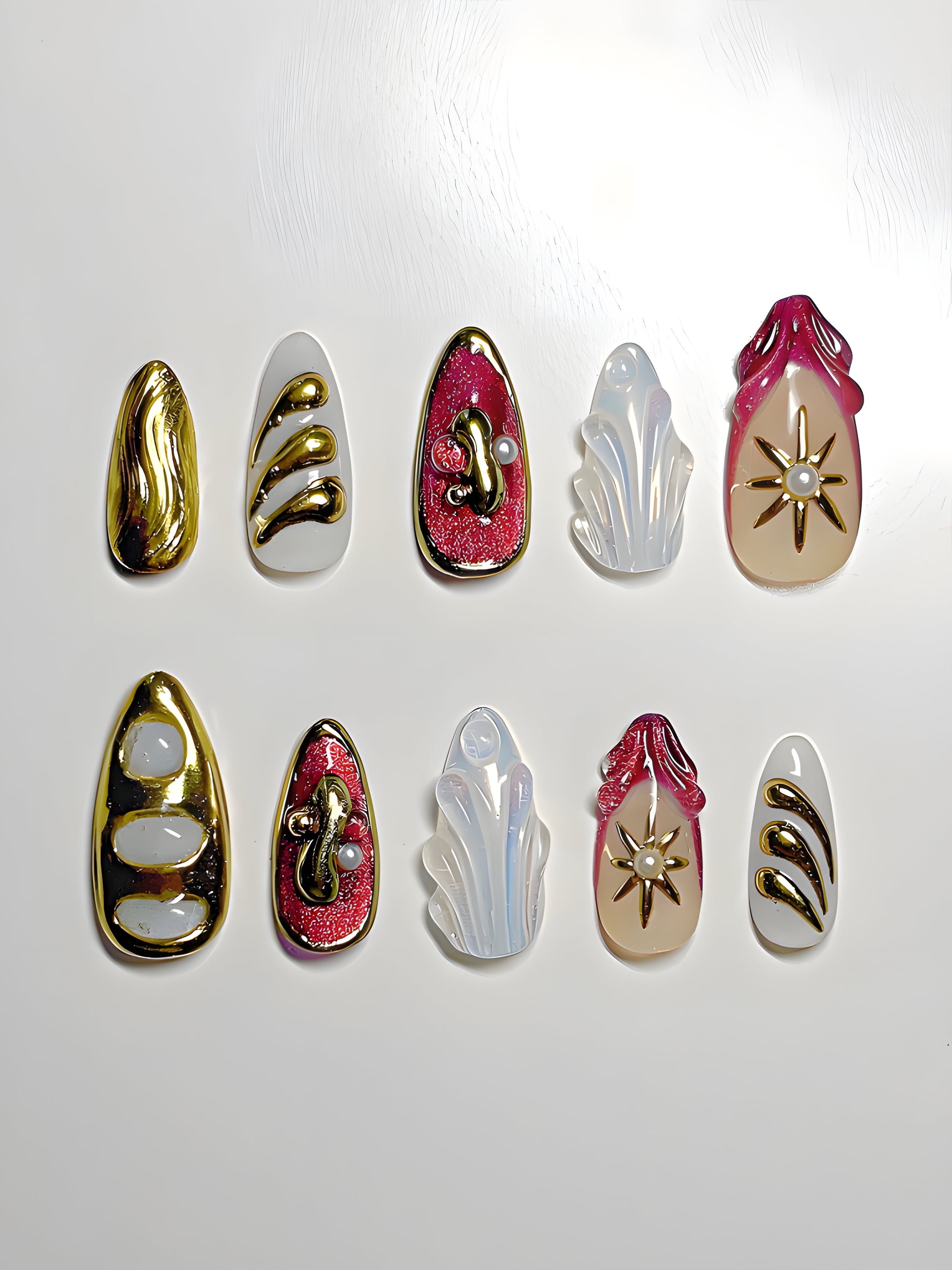 an ethereal fusion of bordeaux and milky white hues, veiled in chrome, and brought to life with intricate 3D gold detailing and soft pearl embellishments