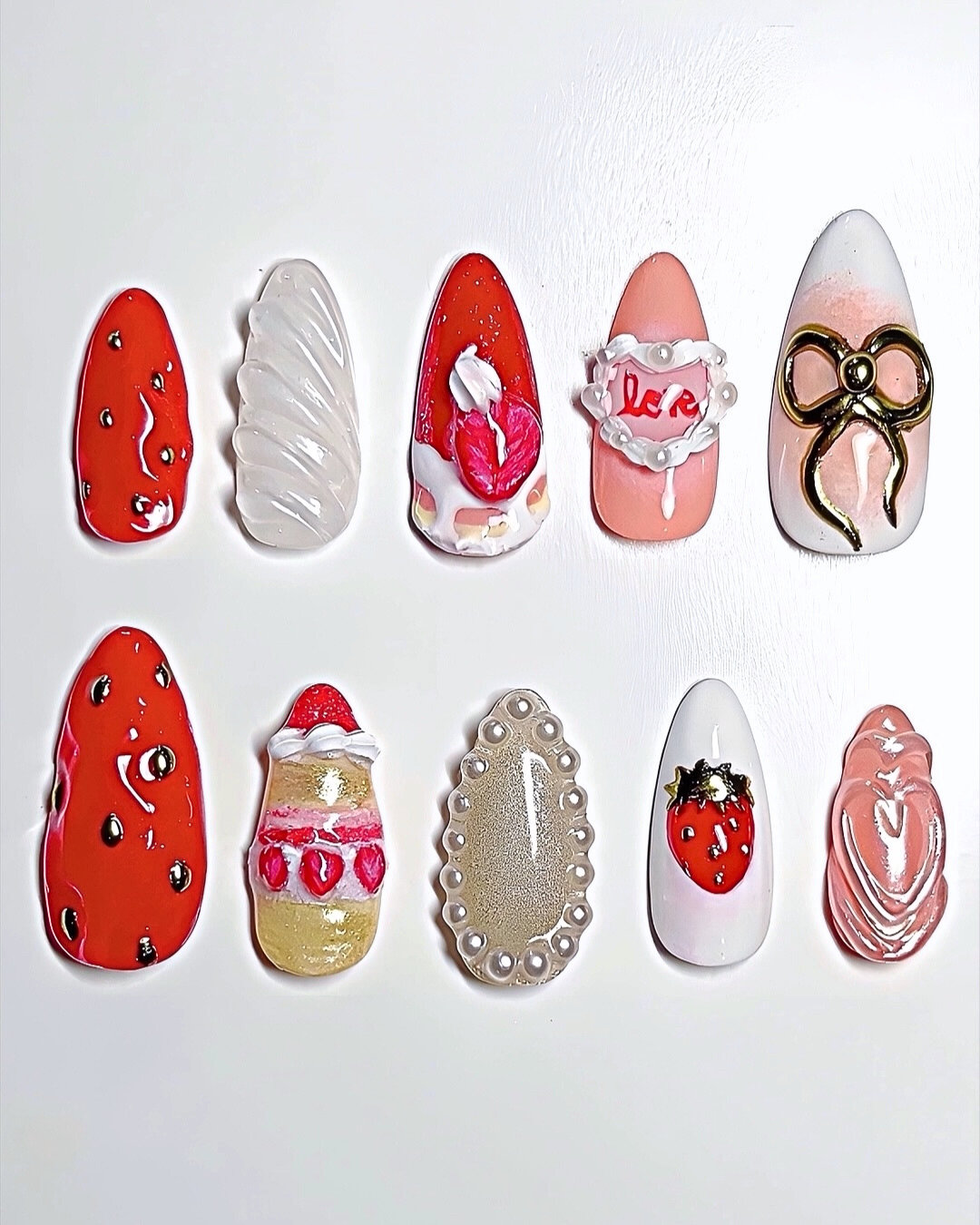 a deliciously detailed strawberry and shortcake-inspired set, featuring meticulously handcrafted 3D designs and subtle gold chrome accents—capturing the sweetness and charm of a decadent dessert